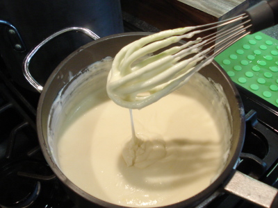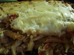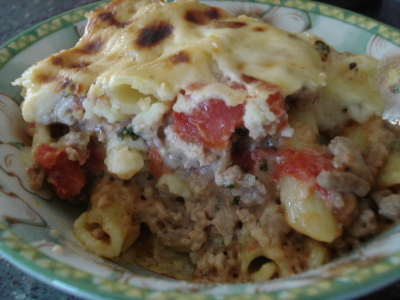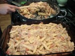 Mike and I hosted a get together last Friday night. Since we both had to work during the day I came up with the idea to make a lasagna because we could make it in advance. I ended up using a recipe I found in the December 07 Food & Wine Magazine. It was a variation on a lasagna and looked really yummy. It consisted of penne pasta, a hearty amount of lamb and veal, some tomatoes and a creamy cheese sauce. It turned out really good. A small amount goes a long way with this dish. It’s very rich. We easily fed 9 people and still had leftovers for two more meals.