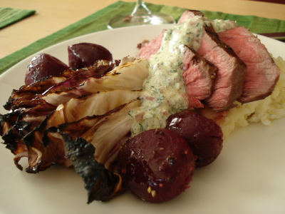 So that’s how we ended up eating a weird cut of buffalo. Oddly after scouring epicurious and foodtv.com I couldn’t find that many preparation options for our broil. We ended up using a recipe I found on the Eating Well website. Because Buffalo is a super lean meat you have to cook it pretty rare to avoid making it tough. Mike as always did a bang up job grilling and everything turned out nice. The sauce was similar to a Greek tzatzikiz and went perfect with the meat and the bitter radicchio. I adore beets so those were the highlight of the dish for me. Although tasty I don’t think this will go on our list of things to make again.