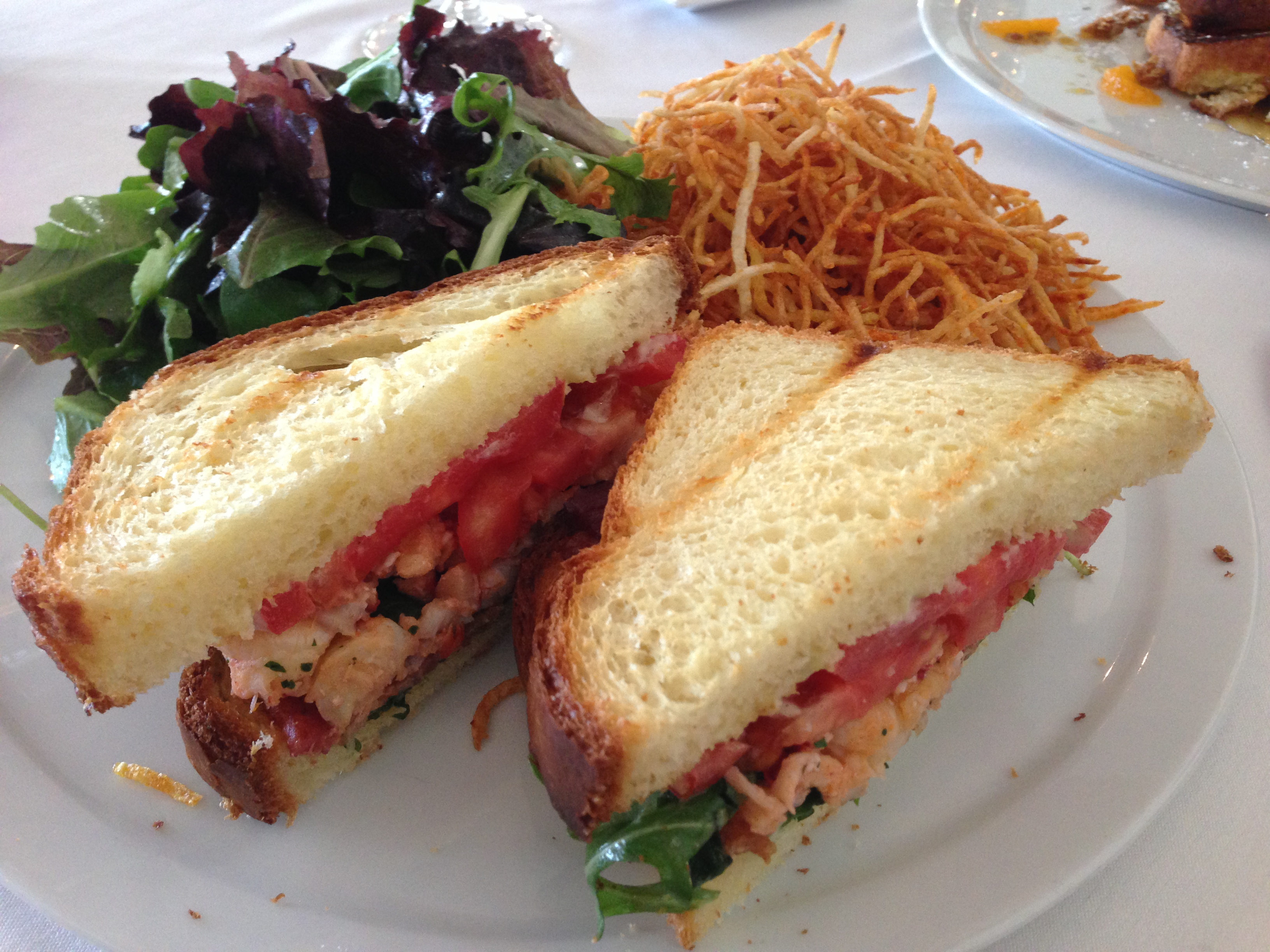 Redd lobster club, poached maine lobster, bacon, lemon aioli, shoestring potatoes