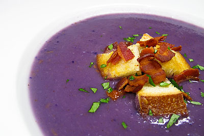 If Willy Wonka made a soup it would look like this. I made some modifications to the original recipe and created something very unique. Instead of Savoy cabbage I used Red and instead of yukon gold potatoes I used Red which is weird because the soup turned out purple. People who know me will think I did this on purpose because purple is my favorite color but I really had no clue that this would be the outcome of my tinkering with the ingredients.