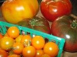 My favorite farmers market in the area is in Campbell. There are 2-3 blocks full of art, fruits, veggies, flowers, baked goods, jams, food carts, herbs, pasta, fish, cheese and more. Last Sunday Mike and I strolled through while eating a homemade raspberry cheesecake poppy-seed muffin. Yum! Then we shared a deliciously fresh gigantic savory crepe with spinach, tomato, cheese and lemon. Warning: eat before you go or you will spend all your money on pre-made foods… Finally we purchased some goodies to take home. When it comes to produce I usually buy from the farms that specialize in one or two items instead of 10. First stop, the heirloom tomato booth (you will see what we created with these here soon). Mike and I went crazy at Tomatero, the organic tomato stand and then grabbed some potatoes from Zuckerman’s Farms. If you are in the mood for strawberries check out Rodriguez farms (they’re delicious and organic!). You’ll find plenty of samples so take a walk through before you buy.