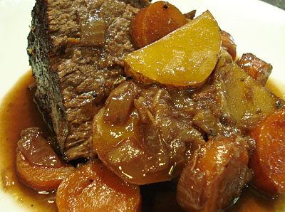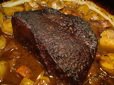 When the weather starts to get cooler I like to bust out my trusty dutch oven and make one-pot meals. We had a bag of potatoes from our produce delivery to use so I decide to make a pot roast. I found an interesting recipe online from Dave Lieberman. It was remarkably easy to prepare and tasted magnificent. The hint o’ honey and the wine (Santa Cruz Zin) made the dish sing. The veggies and beef sucked up all the flavors and were tender and sweet.