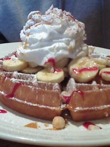 You know what I ordered and Mike chose one of the specials: coconut and banana waffle with macadamia nuts and raspberry syrup.