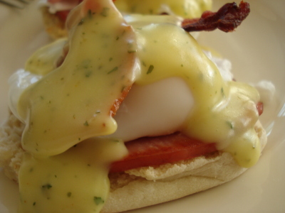 I finally attempted to make Eggs Benedict at home. I have been traveling to all kinds of breakfast cafes trying to find the Best Benedict of the Bay when I thought “Hey, I can do this.” So I decided on a ham AND bacon benedict smothered in, of course, Béarnaise. For a first try at pouched eggs I was pretty impressed with the creation Mike and I concocted. Our eggs were a little less runny than I would have liked but other than that it was pure heaven. Now all I need to do is work up a mean potato side dish and I could be in the running.