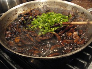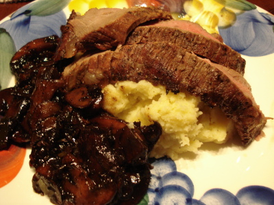 Grilled Flank Steak with sauteed Portabella and Cremini mushrooms and garlic mashed potatoes. They found the recipe on epicurious. The steak was marinated in a soy mixture and grilled to perfection. The mushrooms were combined with a hefty amount of balsamic so they had a peppery kick. Everything turned out delicious.