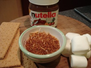 Our 105 lb black lab mix is deathly afraid of fireworks. Most of the evening he is cowering in our closet as our neighbors light off M-80’s loud enough to rock our foundation. This year in between consoling Mr. Ed we made S’mores. I decided I wanted to do something different so instead of a chocolate bar we used Nutella. I also toasted some coconut to toss on top because I like it. The Nutella was a brilliant substitution. Instead of the usual semi melted chunk of chocolate we had creamy chocolaty hazelnut. Give me S’more! I’ll never use a chocolate bar again…