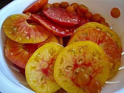 My favorite farmers market in the area is in Campbell. There are 2-3 blocks full of art, fruits, veggies, flowers, baked goods, jams, food carts, herbs, pasta, fish, cheese and more. Last Sunday Mike and I strolled through while eating a homemade raspberry cheesecake poppy-seed muffin. Yum! Then we shared a deliciously fresh gigantic savory crepe with spinach, tomato, cheese and lemon. Warning: eat before you go or you will spend all your money on pre-made foods… Finally we purchased some goodies to take home. When it comes to produce I usually buy from the farms that specialize in one or two items instead of 10. First stop, the heirloom tomato booth (you will see what we created with these here soon). Mike and I went crazy at Tomatero, the organic tomato stand and then grabbed some potatoes from Zuckerman’s Farms. If you are in the mood for strawberries check out Rodriguez farms (they’re delicious and organic!). You’ll find plenty of samples so take a walk through before you buy.