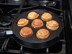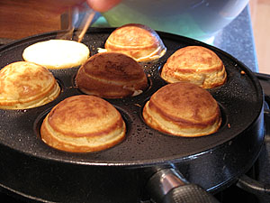 Put 1/8 tsp. melted butter in each well of a filled-pancake pan. Set over medium heat and heat until the butter begins to bubble. Pour 1 Tbs. batter into each well. Spoon 1 tsp. of the filling of your choice into the center of each pancake and top with 1 Tbs. batter. Cook until the bottoms are golden brown and crispy, about 3 minutes. Using 2 skewers, flip the pancakes over and cook until golden and crispy, about 3 minutes more. Transfer the pancakes to a plate. Repeat with the remaining batter and filling. Dust with powdered sugar.